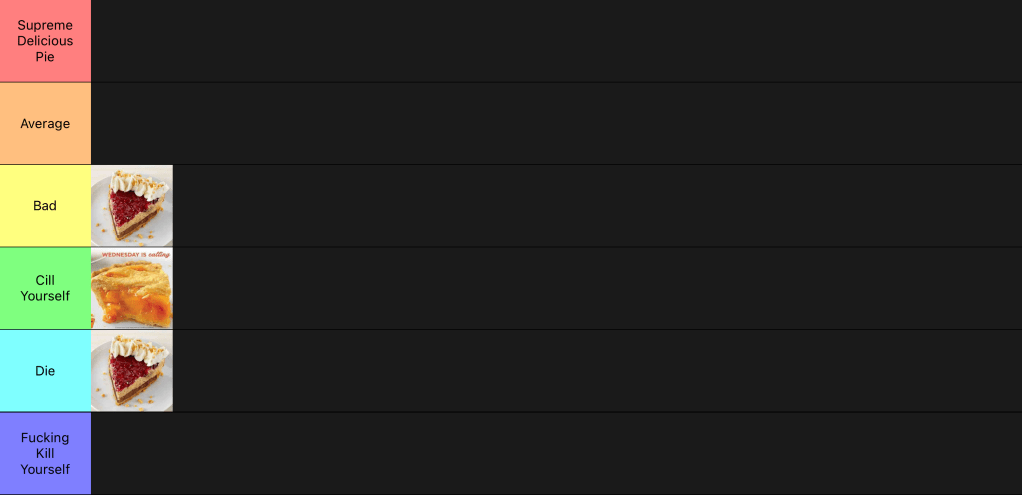 Peanut butter & jelly seasonal pie – a split in the rankings! CM has voted b tier and I have voted d tier.